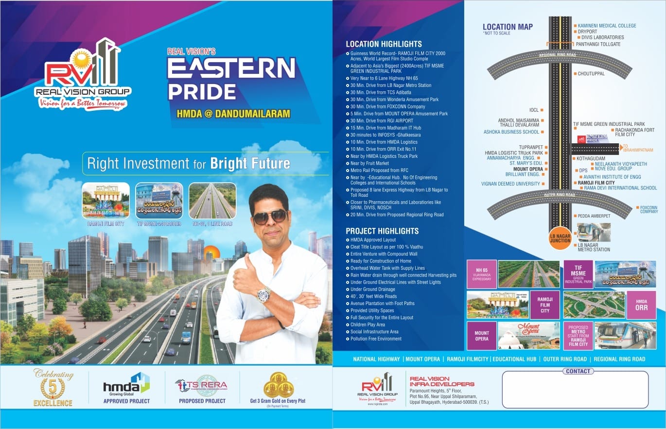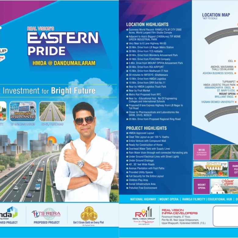 Looking for a smart investment with high growth potential? Eastern Pride offers premium HMDA-approved residential plots in a rapidly developing corridor near Dandumailaram – a location surrounded by infrastructure, industries, and connectivity.