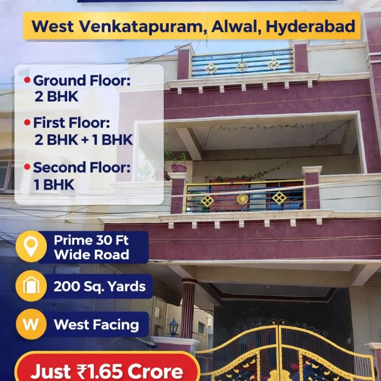 Located in the well-developed residential locality of West Venkatapuram, Alwal, this spacious west-facing independent house is built on a 200 Sq. Yds plot and is situated on a 30 ft road, offering excellent accessibility and future value.