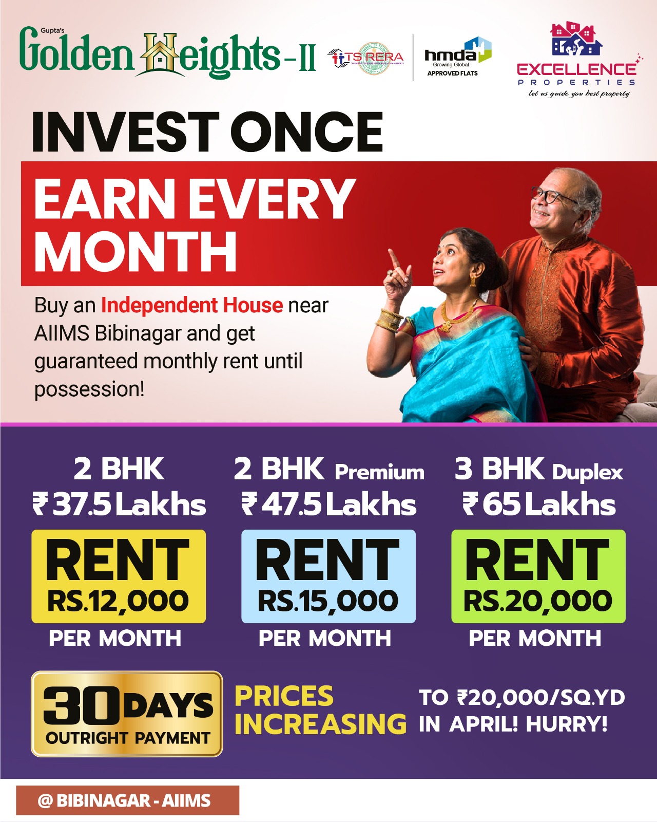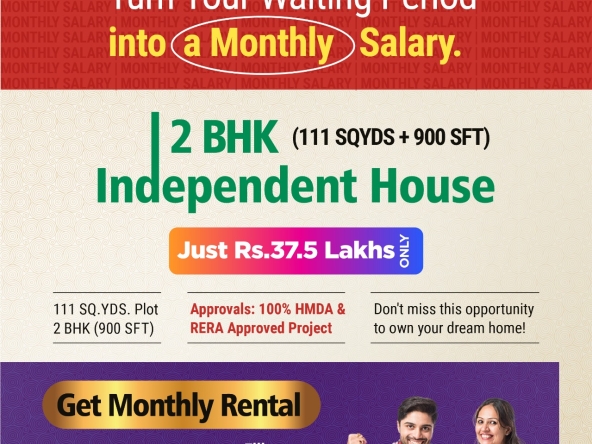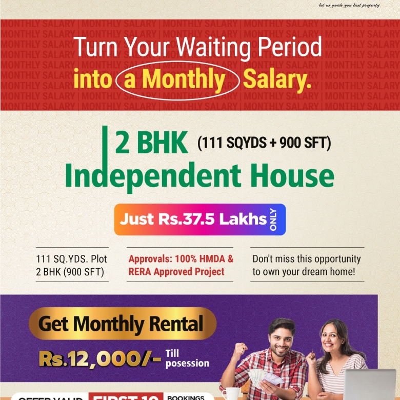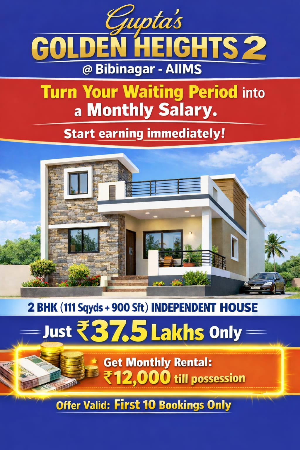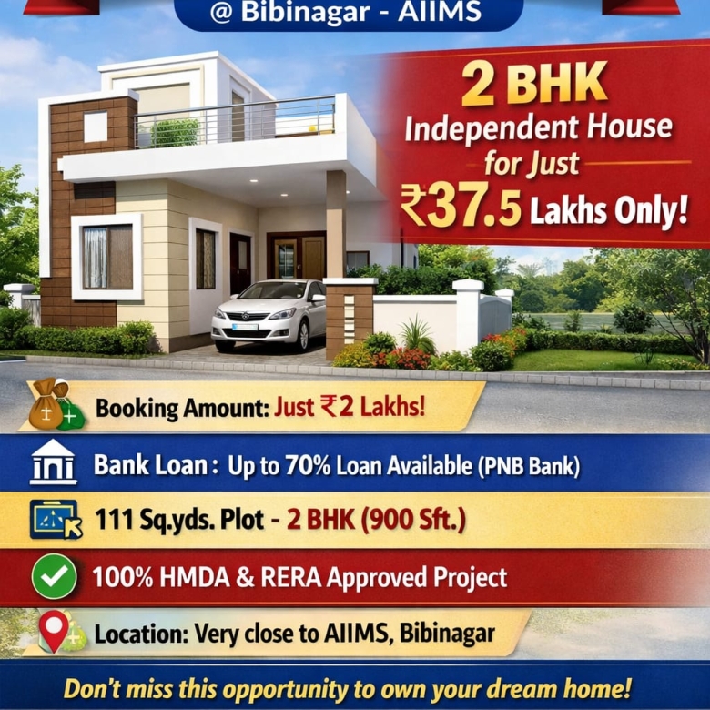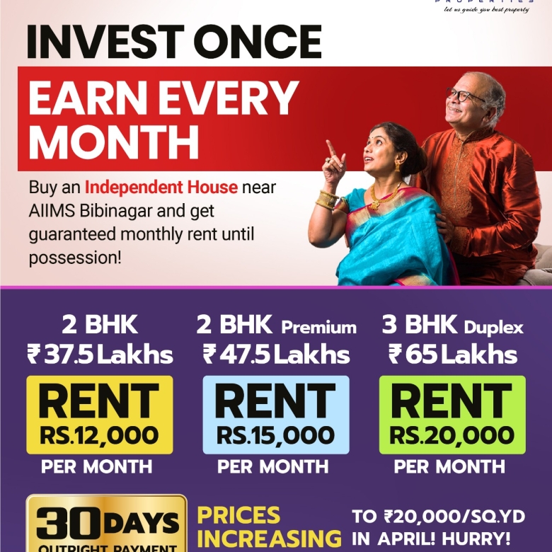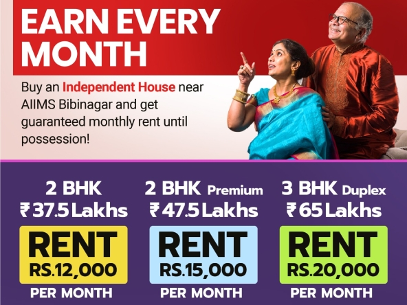 Maximize your investment near AIIMS Bibinagar! We are offering a guaranteed Advance Rental Return till Possession for customers who make an outright payment on our Independent Houses.