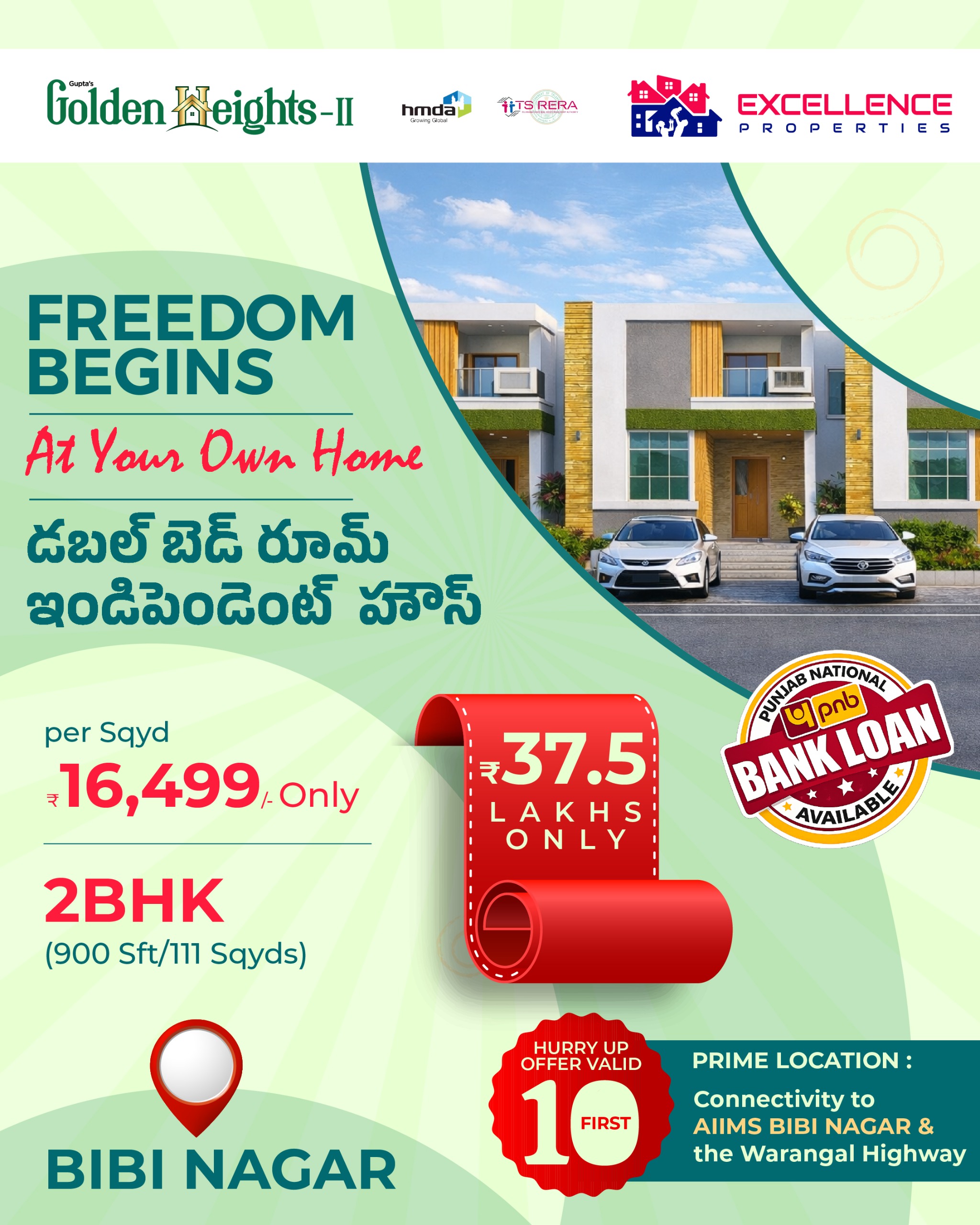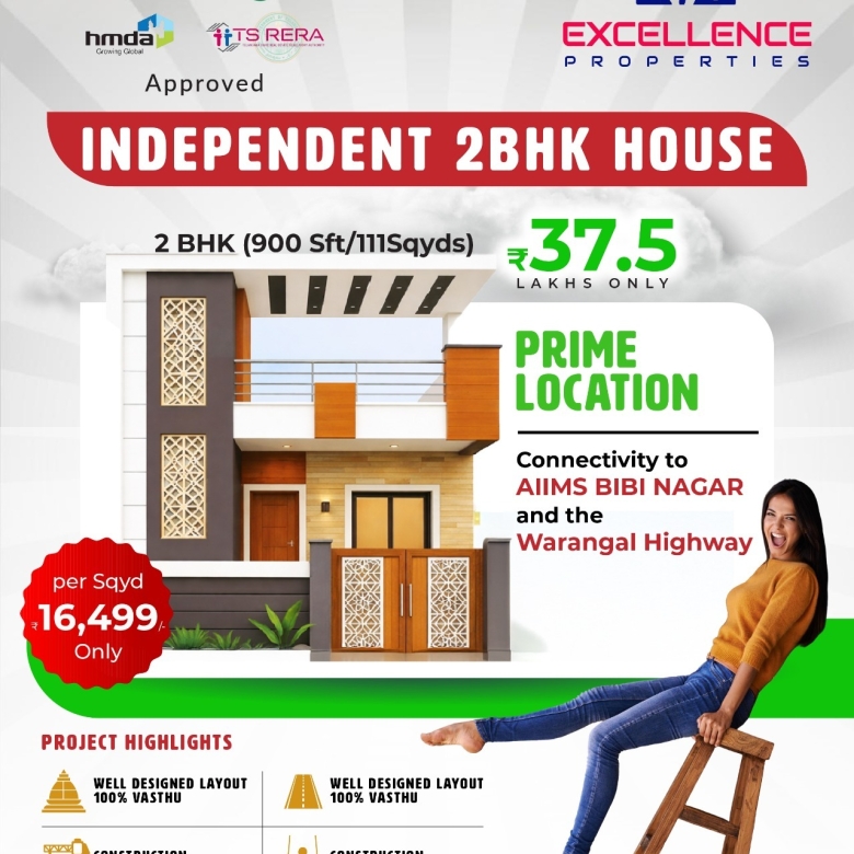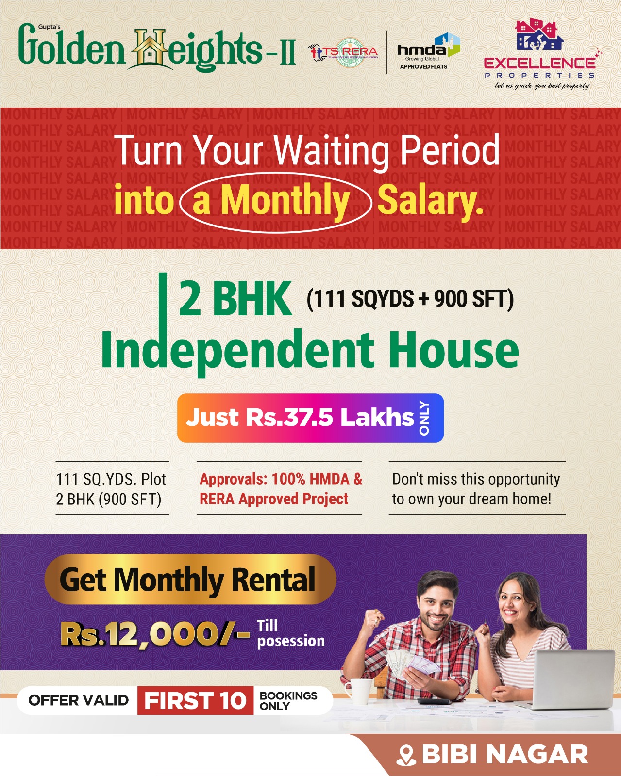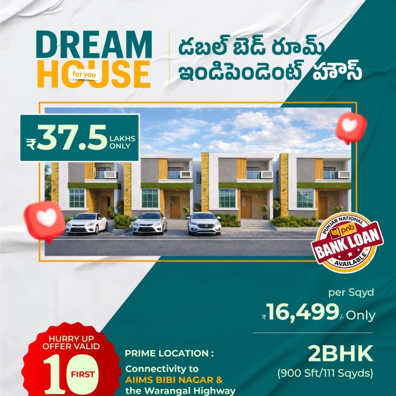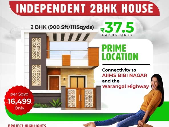 Maximize your investment near AIIMS Bibinagar! We are offering a guaranteed Advance Rental Return till Possession for customers who make an outright payment on our Independent Houses.