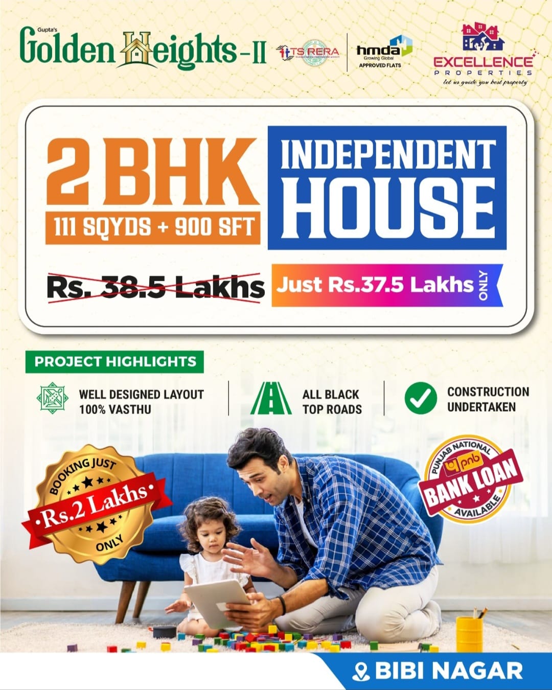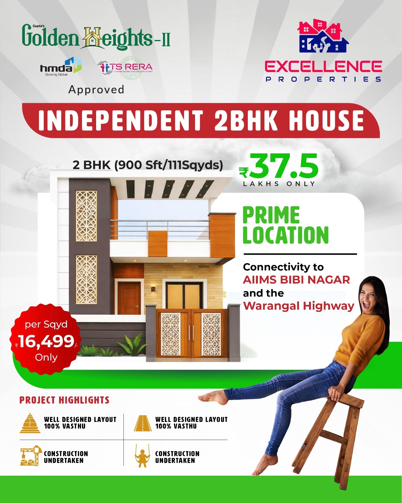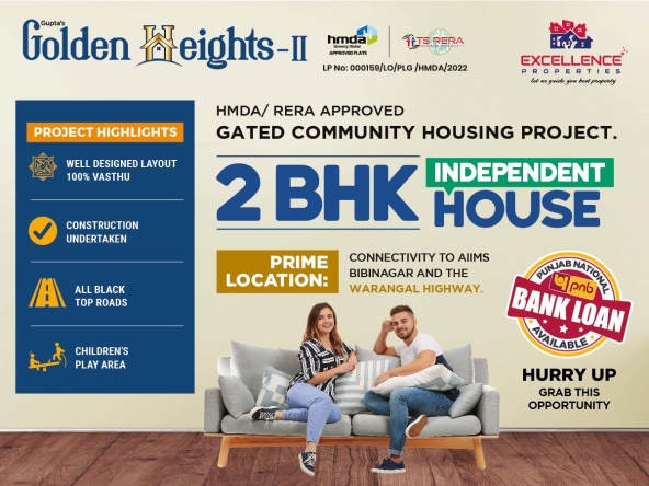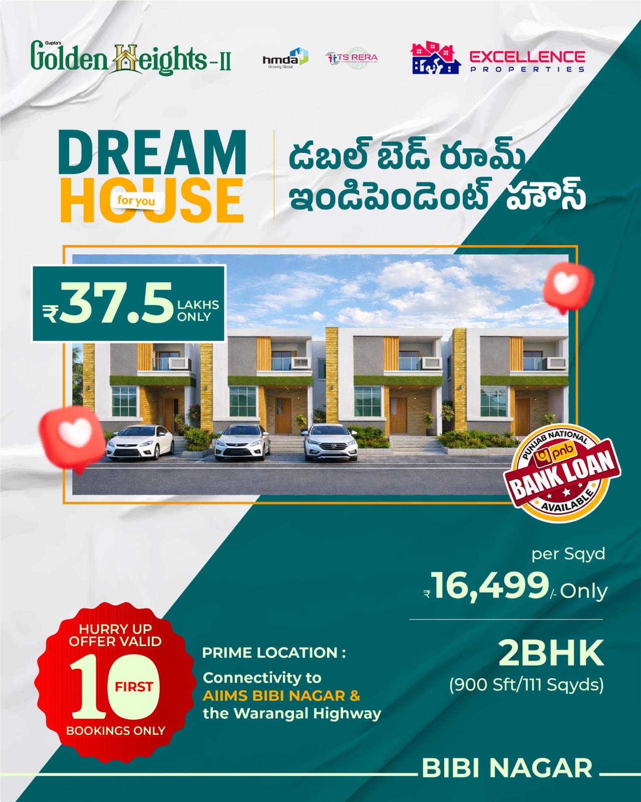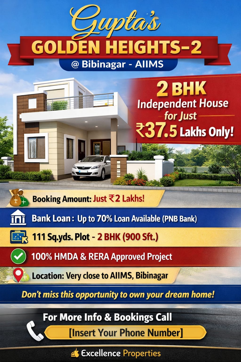 Maximize your investment near AIIMS Bibinagar! We are offering a guaranteed Advance Rental Return till Possession for customers who make an outright payment on our Independent Houses.