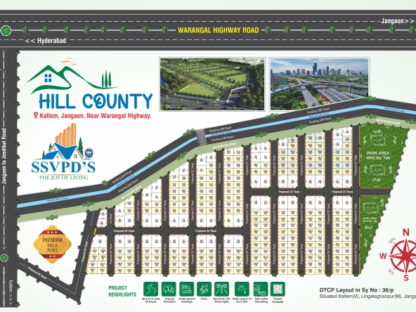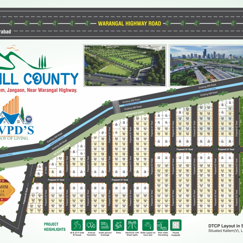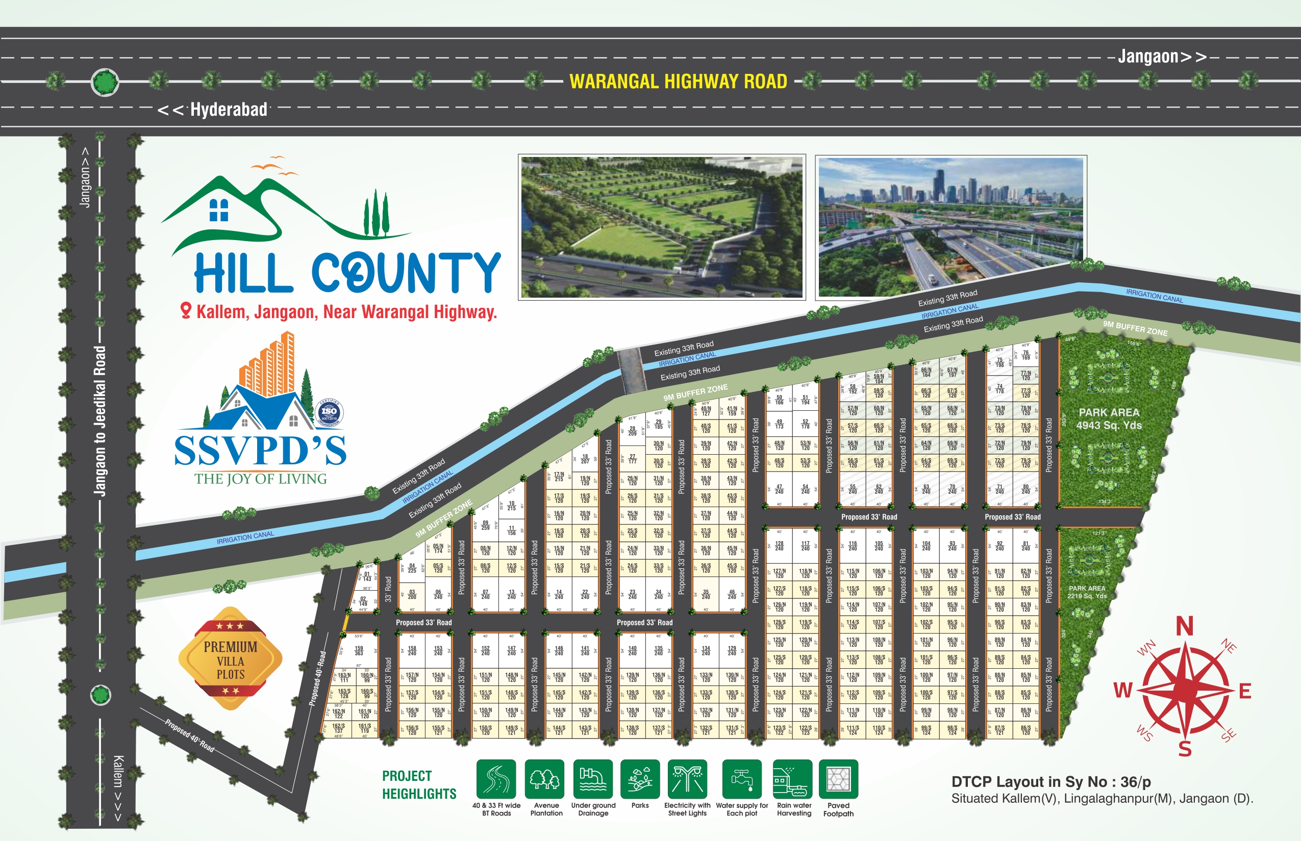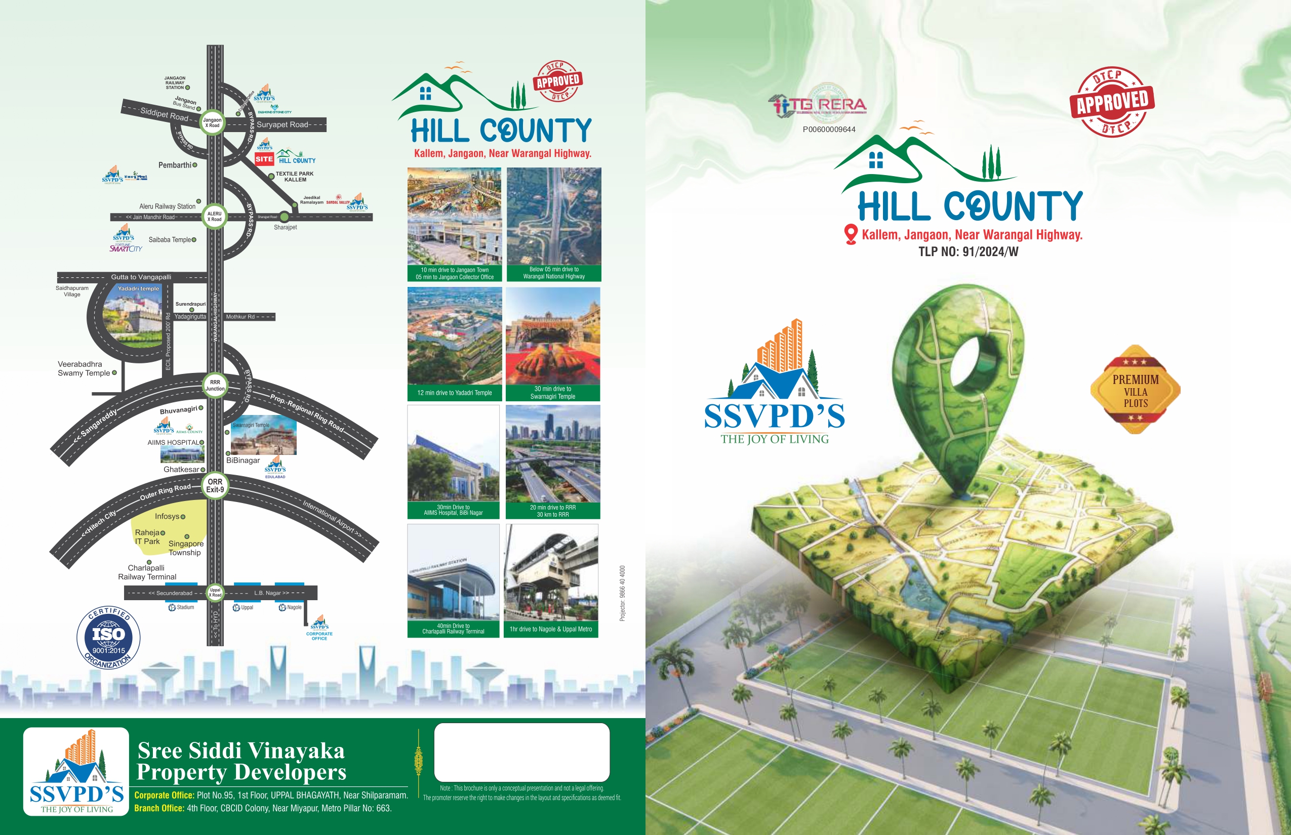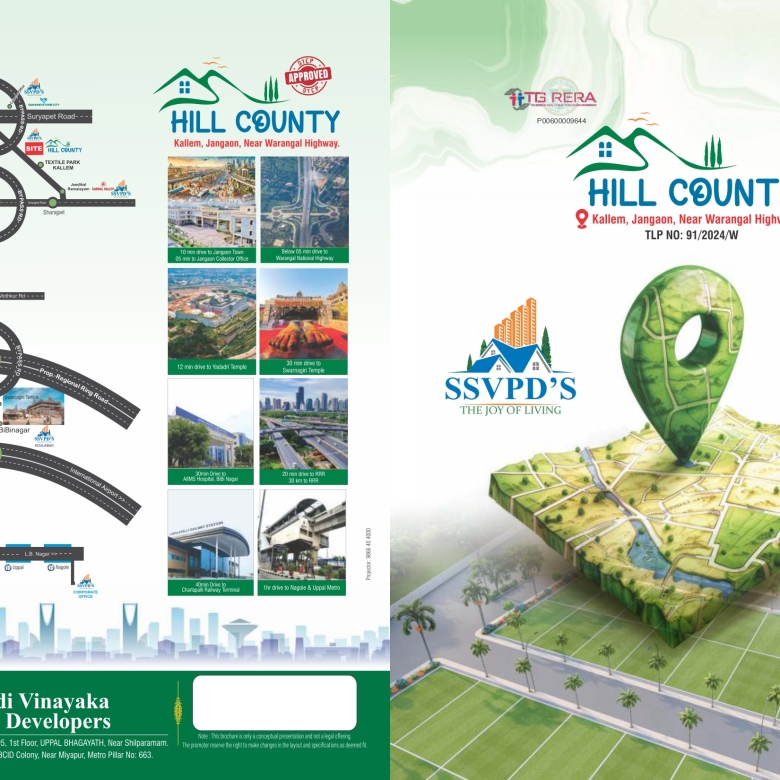 Presenting Hill County, a premium DTCP-approved villa plots project by Sree Siddi Vinayaka Property Developers (SSVPD’s – The Joy of Living), strategically located at Kallem, Jangaon, just off the Warangal Highway.
