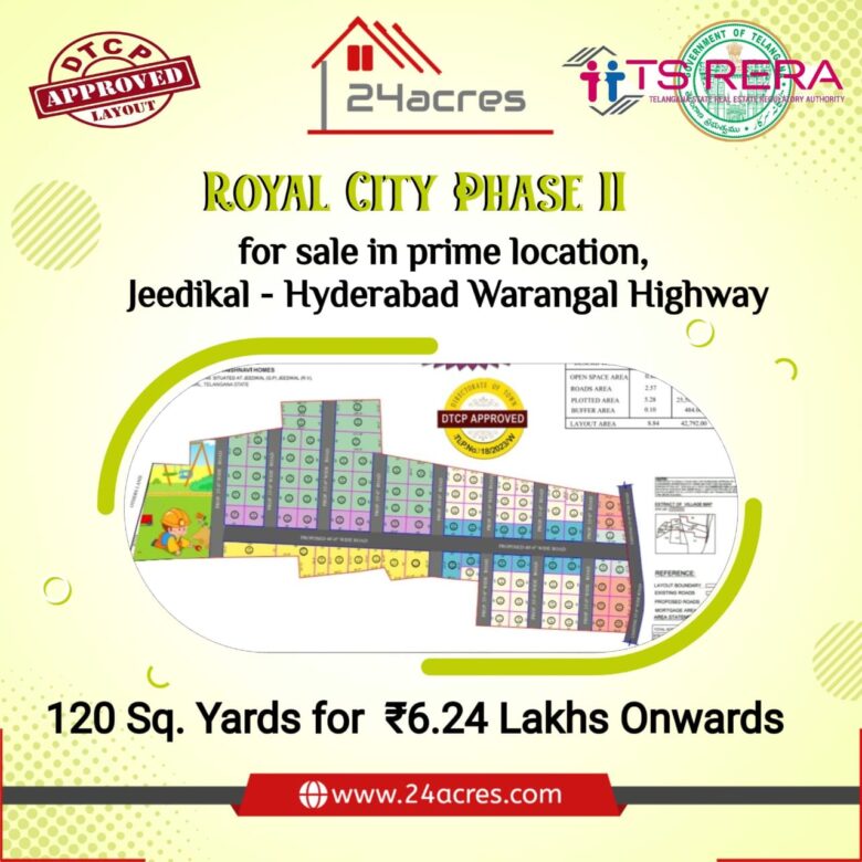 π° Explore Royal City Phase II β DTCP and RERA Approved Plots for Sale in Jeedikal, Yadagirigutta! Donβt miss out on this opportunity to own your piece of paradise. Rs 6.24 Lakhs Onwards.