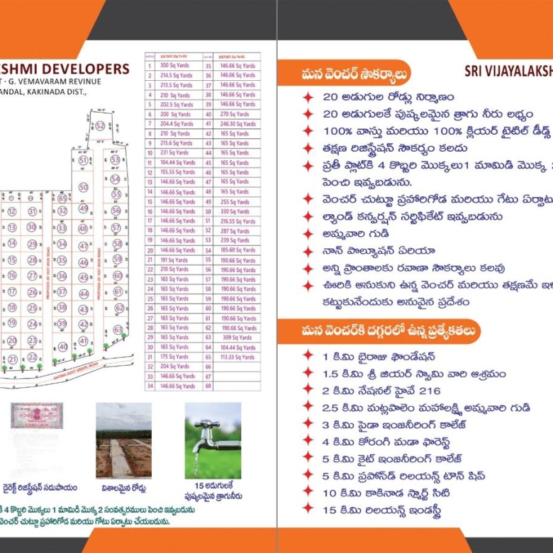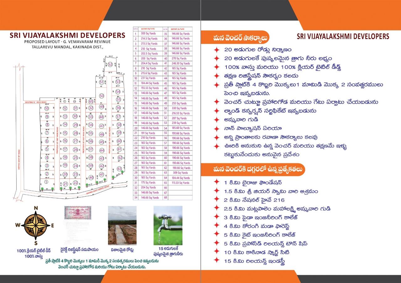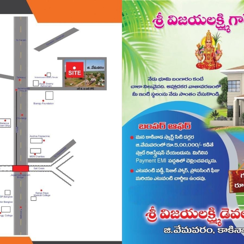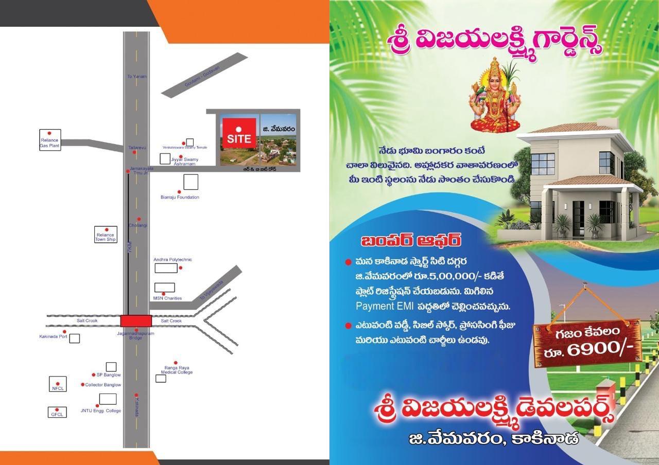 Sri Vijayalakshmi Gardens is a residential open plot venture located near J. Vemavaram in Kakinada district. The project offers well-planned plots suitable for building your dream home or for long-term investment in a rapidly developing area.