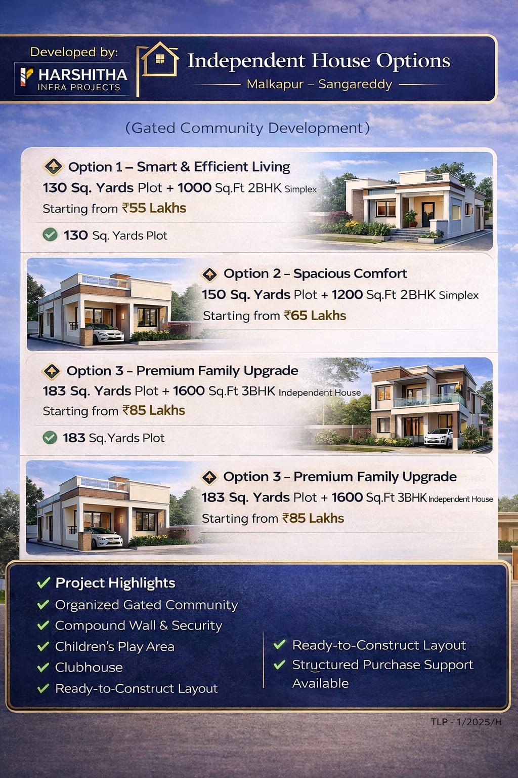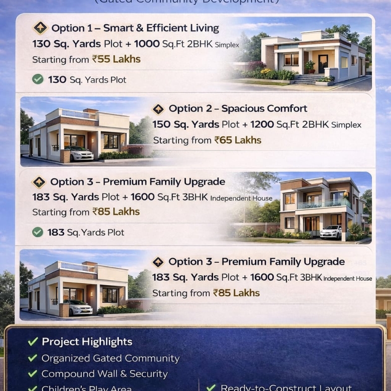 🔹 Option 1: 130 Sq. Yards + 1000 SFT 2BHK Simplex – Rs 55 Lakhs